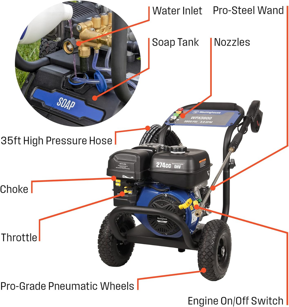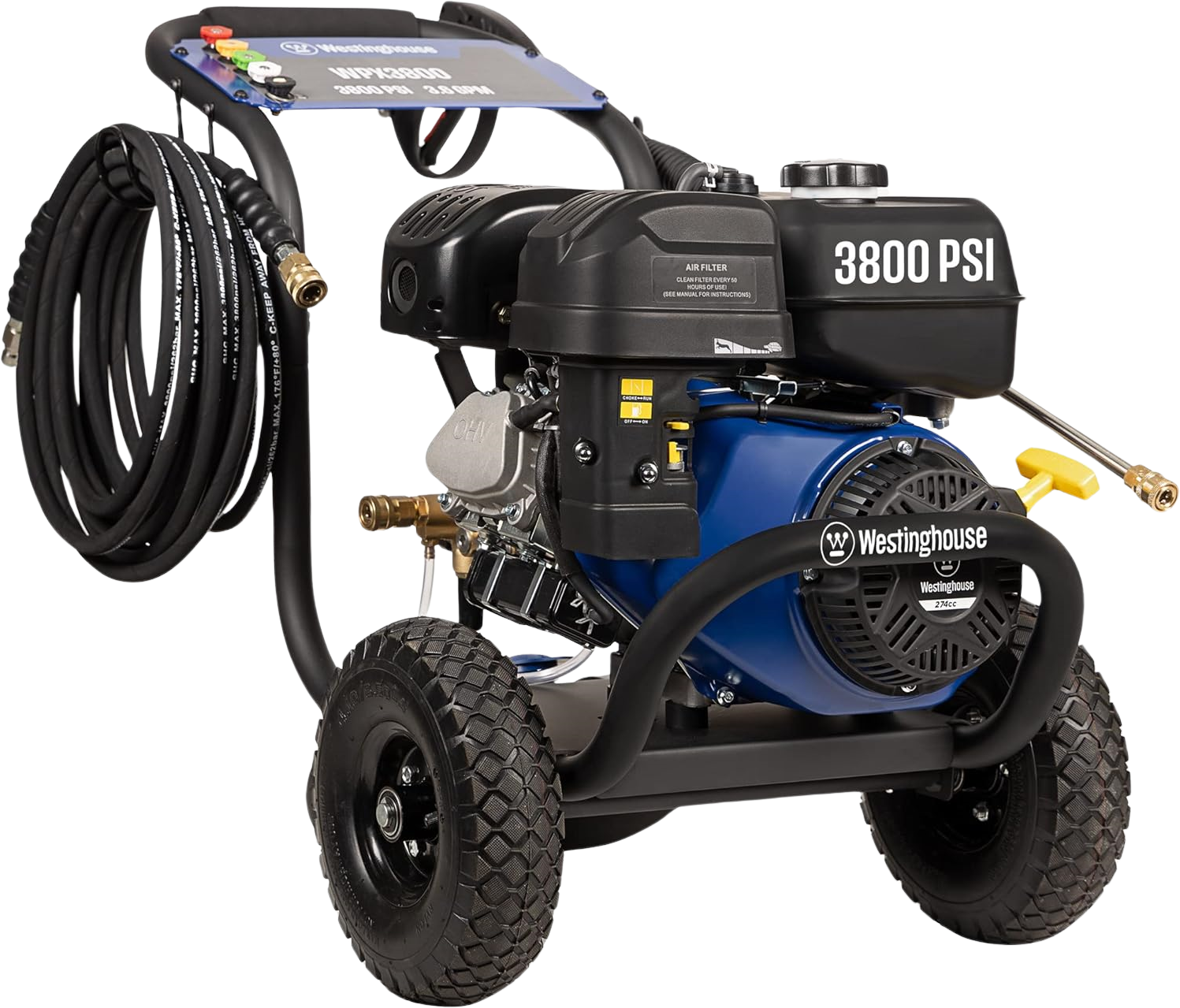 The Westinghouse WPX3800 Gas Powered Pressure Washer, with 3800 PSI and 3.6 GPM, is designed to tackle your toughest cleaning jobs with ease. Built with a powerful 4-cycle OHV Westinghouse Engine and a maintenance free axial cam pump, it’s meant for powerful heavy-duty cleaning. With 5 interchangeable nozzle tips and a built in 3 L soap tank, the WPX3800 has the versatility to handle a variety of situations and surfaces including brick, stone, concrete, wood, aluminum, and iron. The 5 L fuel tank and never-flat wheels offer easy mobility and maneuverability.