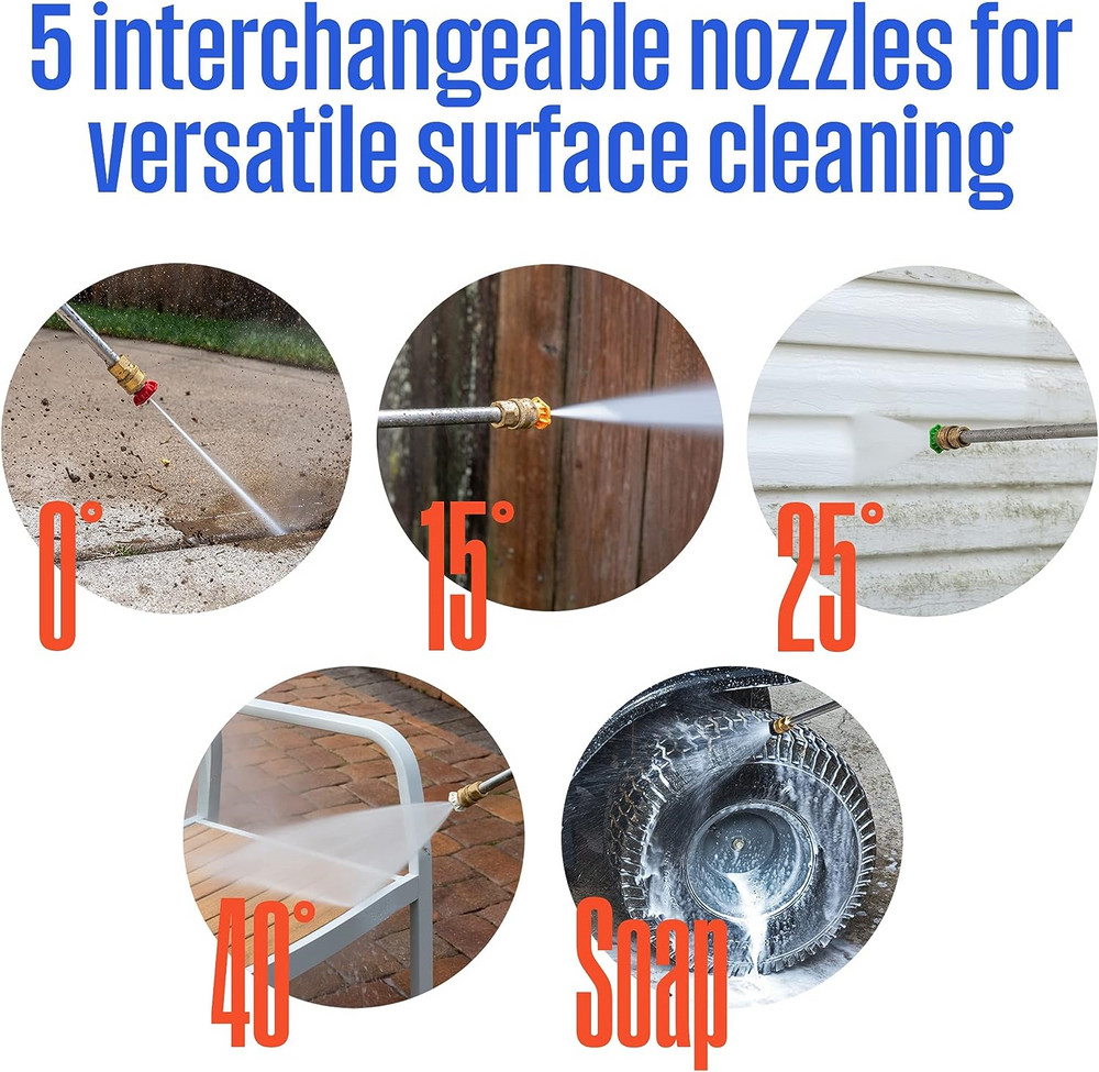 - 5 Quick Connect nozzles: 0°, 15°, 25°, 40°, and soap applicator tip for adjustable spray