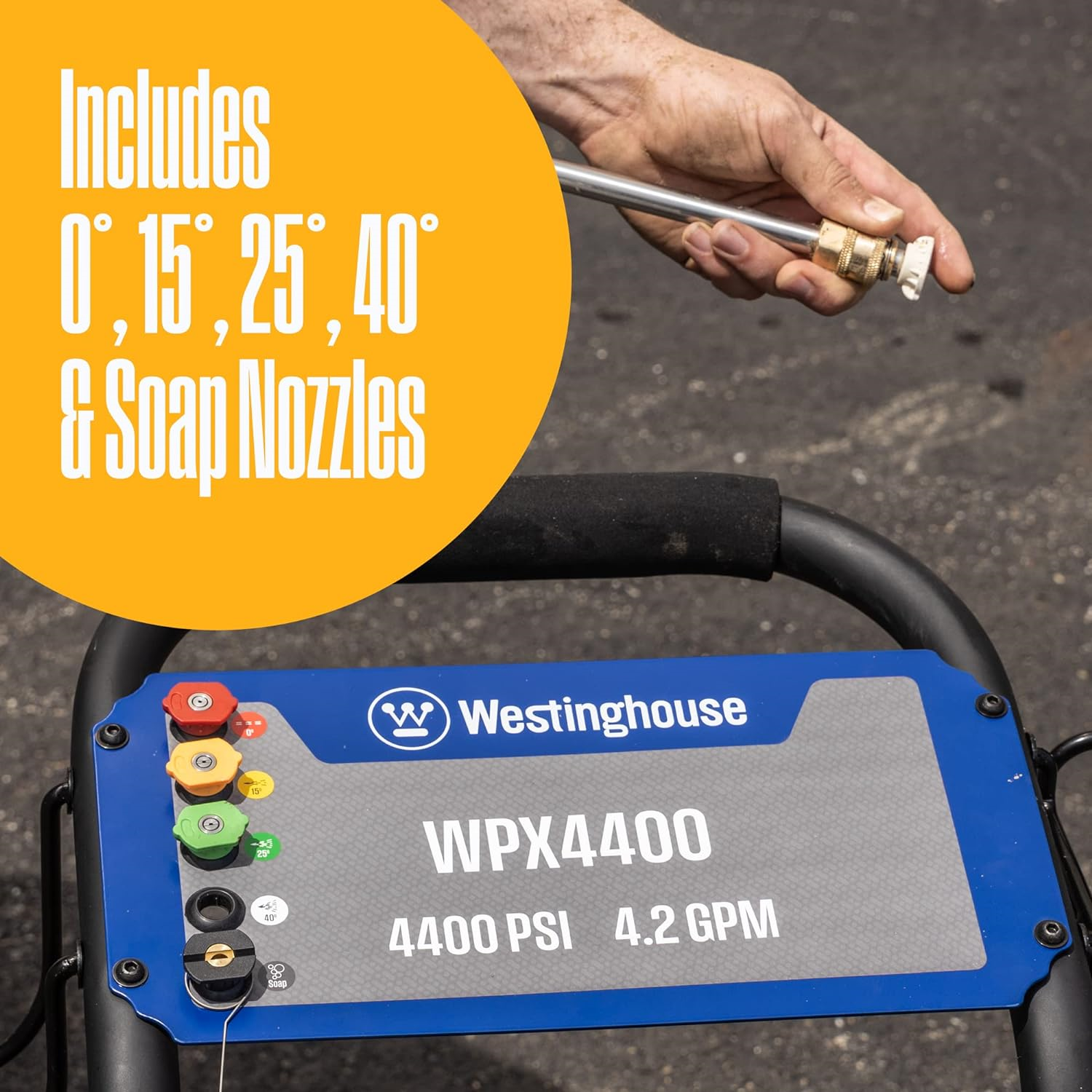 The Westinghouse WPX4400 Gas Powered Pressure Washer, with 4400 PSI and 4.2 GPM, is designed to tackle your toughest cleaning jobs with ease. Built with a powerful 4-cycle OHV Westinghouse Engine and a maintenance free axial cam pump, it’s meant for powerful heavy-duty cleaning. With 5 interchangeable nozzle tips, the WPX4400 has the versatility to handle a variety of situations and surfaces including brick, stone, concrete, wood, aluminum, and iron. The 6.5 L fuel tank and never-flat wheels offer easy mobility and maneuverability.